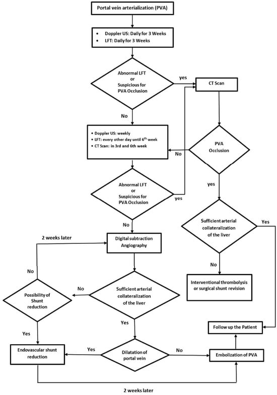 Weekly Doppler ultrasonography and liver function assessments every other day are advised up to the 6th week after PVA. Any signs of liver damage or PVA shunt occlusion during this 6 week follow-up indicate the need for urgent computed tomography angiography (CTA) in the arterial and portal venous phases to assess whether interventional thrombolysis or operative shunt revision is required. Anticoagulant treatment was contemplated for all patients within the initial 6 weeks.