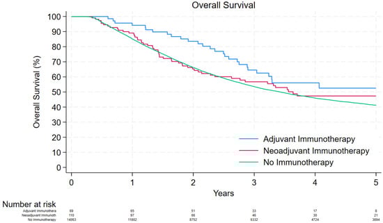 Kaplan–Meier curve depicting the overall survival of patients that were treated with adjuvant immunotherapy, neoadjuvant immunotherapy, and no immunotherapy.