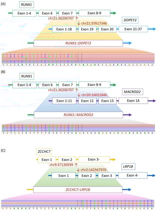 Schematic representation of the novel gene fusions: (A) RUNX1::DOPEY2, (B) RUNX1::MACROD2, (C) ZCCHC7::LRP1B.
