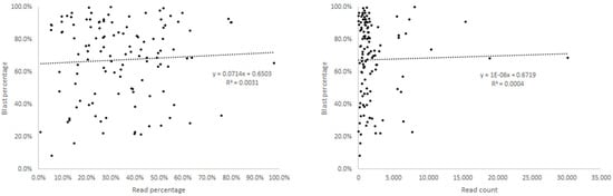 Comparison of the read percentage and read count in targeted RNA sequencing with the blast percentage.