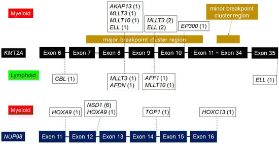 We analyzed how breakpoints are distributed in KMT2A and NUP98, which form fusions with many different partner genes (Figure 3). For KMT2A, breakpoints were most frequently observed between exon 8 and exon 10. All breakpoints for NUP98 were situated between exon 11 and exon 16.