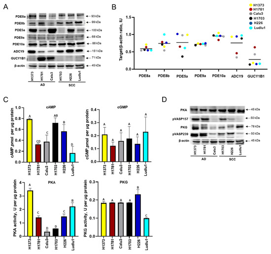 Baseline characteristics of non-small-cell lung cancer (NSCLC) cell lines. Untreated lung cancer adenocarcinoma (AD) cell lines (H1373, H1781, and Calu3) and lung cancer squamous-cell carcinoma (SCC) cell lines (H1703, H226, and Ludlu1) in exponential phase of growth were screened. (A) Protein expression of five isoforms of enzymes involved in cyclic nucleotide catabolism, PDE8a, PDE8b, PDE5a, PDE9a, and PDE10a, and two anabolic enzymes, adenylate cyclase (ADCY9) and guanylate cyclase (GUCY1B1), assessed by Western blotting. β-actin was used as the loading control. (B) Cyclic nucleotide catabolic and anabolic enzymes in NSCLC cell lines. Quantification of the ratio of cyclic nucleotide metabolic pathway proteins versus β-actin in NSCLC cell lines. Optical density of the signal is reported in intensity units (IUs). Center lines are in black. (C) Basal cAMP and cGMP and direct protein kinase (PKA and PKG) activity determined by cyclic nucleotide ELISA kit and with colorimetric activity kit, respectively. Cellular metabolite concentrations expressed as pmol cyclic nucleotides per µg of cellular protein. Enzymes activity presented as U per µg of cellular protein. Vertical bars represent standard error of the mean (SEM). Different letters indicate values that are significantly different from each other (p < 0.05); N = 2, 4, 5. (D) Enzymes associated with cyclic nucleotide metabolism in NSCLC cell lines. Protein kinase A (PKA), protein kinase G (PKG), and phosphorylated vasodilator-stimulated phosphoprotein, VASP (Ser157 and Ser259), were measured in six NSCLC cell lines by Western blotting. β-actin was used as the loading control. The original Western blot figures can be found in File S1.