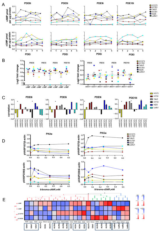 Phosphodiesterase inhibitors modulate cyclic nucleotide signaling in NSCLC cell lines. NSCLC cell lines (H1373, H1781, Calu3, H1703, H226, and Ludlu1) in exponential phase of growth were exposed for 72 h to PDE8i (0–6 nM), PDE5i (0–6000 nM), PDE9i (0–60 nM), or PDE10i (0–6 nM), followed by the following measurements: (A) Intracellular cAMP and cGMP levels in NSCLC cells as determined with a cyclic nucleotide ELISA kit. Cellular metabolite concentrations as expressed as pmol cyclic nucleotides per µg of cellular protein. N = 4, 5. (B) Simultaneous changes in cAMP and cGMP concentrations; expression level of adenylate cyclase (ADCY) and guanylate cyclase (GUCY) in the presence of PDE inhibitors. Data are presented as log2 fold changes in cAMP or cGMP concentration (left panel) and ADCY or GUCY protein expression level (right panel) between PDEi-treated (all concentrations) versus untreated cells. Center line and upper and lower quartiles for all cells are in grey. (C) Effect of PDEis on indirect PKA and PKG activity as determined by measuring pVASP157 and pVASP239 protein levels via Western blotting. β-actin was used as the loading control. Data are presented as correlations between increased concentrations of PDEi and changes in target protein level per cell line. * indicates significant differences (p < 0.05). (D) Cell-specific activation of PKA and PKG by direct activators (8-bromo-cAMP for PKA or 8-bromo-cGMP for PKG) as determined by phosphorylation of PKA target (pVASP157) and PKG target (pVASP239) measured by Western blotting. Cells were treated with PKA activator (0–1 mM) or PKG activator (0–1 mM) for 72 h. β-actin was used as the loading control. Optical density of the signal is reported in intensity units (IUs). (E) Cluster analysis: heatmap profiles of NSCLC exposed to PDEi EC50 with cAMP, cGMP, pVASP157, and pVASP239 (N = 24). Columns of the heatmap represent samples with annotated cluster membership. Rows of the heatmap represent metabolites (cAMP or cGMP) or activity of PKA or PKG (pVASP157 or pVASP239, respectively).