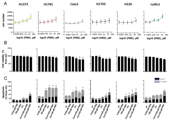 Single-agent PMX displayed a pleiotropic growth-stimulating activity toward all six cell lines (Figure 3A, Tables S2 and S3). To confirm the lack of single-agent PMX cytotoxic activity toward the PDEwt NSCLC cell lines evaluated in our study, we performed additional viability and apoptosis measurements of cells exposed to PMX alone or in combination with cisplatin (Figure 3B,C). Single-agent PMX had no (or only marginal, <2%) cytotoxic activity toward all tested AD and SCC cells (Figure 3B). Importantly, when combined with cisplatin, PMX significantly enhanced platinum cytotoxicity in a dose-dependent fashion, confirming PMX’s activity in combination but not as a single agent in the models evaluated in our study. Confirming those findings, PMX was required to be combined with cisplatin to induce an apoptotic state (7-AAD+, Annexin-V+) (Figure 3B). The only notable exception was H226 cells, which achieved 8.8% apoptotic rate with high-dose PMX alone (11.98 ± 0.61 vs. 20.83 ± 1.93% for control and 250µM PMX, respectively). Single-agent high-dose PMX (250µM) also led to a dramatic increase in H1781, Calu3, and Ludlu1 cells, which entered a pre-apoptotic rate (7-AAD− Annexin-V+), a reversible physiological state akin to autophagy–senescence (Figure 3C). This effect was most pronounced in H1781 cells, where almost 26.14% cells entered this reversible pre-apoptotic state after high-dose PMX exposure (9.76 ± 0.22 vs. 35.9 ± 1.48% for control and 250 µM PMX, respectively).