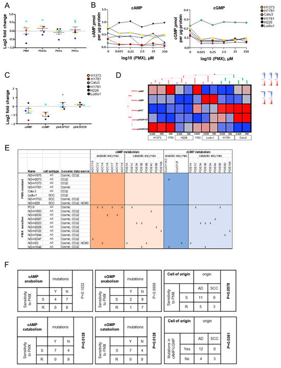 Impairment of cAMP/cGMP catabolism and downstream PKA/PKG signaling are associated with response to PMX in NSCLC. (A) NSCLC cell lines (H1373, H1781, Calu3, H1703, H226, and Ludlu1) in exponential phase of growth were exposed for 72 h to PMX (0.025 µM, 0.25 µM, 2.5 µM, 25 µM, or 250 µM of PMX), followed by measurement of pAKT activation. Data are presented as log2 fold changes in phospho-AKT (pAKT (Ser473) level per cell line between all tested concentrations of PMX, PDE8i, PKAa, and PKGa, and non-treated cells were determined by Western blotting. β-actin was used as the loading control. (B) Intracellular cAMP and cGMP levels in NSCLC cells after PMX treatment were measured with cyclic nucleotide ELISA kit. Cellular metabolite concentrations are expressed as pmol cyclic nucleotides per µg of cellular protein. N = 4, 5. (C). Effect of PMX on cyclic nucleotide metabolism. cAMP and cGMP were measured using cyclic nucleotide ELISA kit. Indirect PKA and PKG activity was determined by measuring site-specific phosphorylation of vasodilator-stimulated phosphoprotein; PKA (pVASP157) and PKG (pVASP239) activity was determined by Western blotting. β-actin was used as the loading control. Data are presented as log2 fold changes in target level per cell line between all tested concentrations of PMX and non-treated cells. (D) Cluster analysis: heatmap profiles of NSCLC exposed to PMX with cAMP, cGMP, pVASP157, pVASP239, and pAKT (N = 30). Columns of the heatmap represent the samples with annotated cluster membership. Rows of the heatmap represent the metabolites (cAMP or cGMP), activated AKT (pAKT), or activity of PKA or PKG (pVASP157 or pVASP239, respectively). (E) Association between cAMP/cGMP metabolic enzyme mutation status and NSCLC sensitivity to PMX in vitro. Single-agent PMX activity was measured using colony formation (those unpublished data were used with the authorization of Dr. Misty Shields and Dr. John Minna) [33]. Mutation status of genes coding for cAMP/cGMP anabolic or catabolic enzymes was assessed using the Cosmic, CCLE, or NCI60 databases. x indicates the presence of non-synonymous mutations. (F) Contingency analyses (Fisher’s exact test) comparing NSCLC histology (AD, SCC), cAMP anabolic/catabolic enzyme mutation status, or cGMP anabolic/catabolic enzymes mutation status (N = 19) with PMX sensitivity.