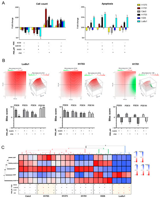 Multi-drug combination anti-NSCLC activity, calculated using normalized cell counts (%DMSO control) adjusted with apoptotic rates, was used as input for multi-drug interaction analysis on SynergyFinder version 3.0 (https://synergyfinder.fimm.fi/) [27]. A combined (all PDEi) Bliss synergy score was calculated for each NSCLC cell line sensitive to a PMX-PDEi combination (Ludlu1, H1703, H1781). Bliss scores were also calculated individually for PDEi in combination with low (0.025 µM) or high (250 µM) PMX concentrations.
