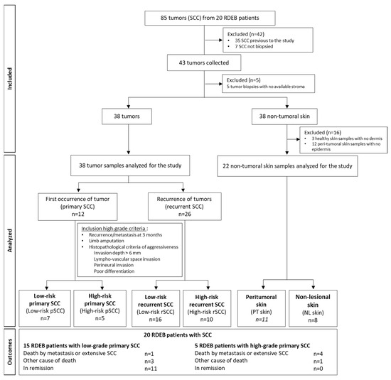 Tumor samples were obtained by biopsy prior to any treatment from 43 RDEB-SCCs. At the time of the surgery, 3 different types of samples were collected from surgical resections and residues using punch biopsies, when possible, from RDEB patients: the tumor, the lesional peri-tumoral skin, and the non-lesional skin for immunohistological and/or molecular analyses. Depending on the size of the tumor and surgical excision, not all biological samples could be collected from the 3 locations for the different experiments. As a result, the use of biopsies was prioritized based on the type of analysis required. A flow chart of the analyzed samples is described in Figure 1.
