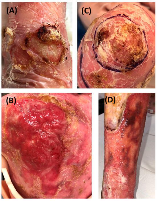 Representative clinical pictures of RDEB-SCCs in the different groups. (A) Low-risk primary SCC developed on the wrist. The tumor is circled. (B) low-risk recurrent SCC developed on the hand with hyperkeratosis. (C) Extensive high-risk primary SCC on the back. (D) Extensive high-risk recurrent SCC on the shin developed 2 months after the excision of a high-risk primary SCC.