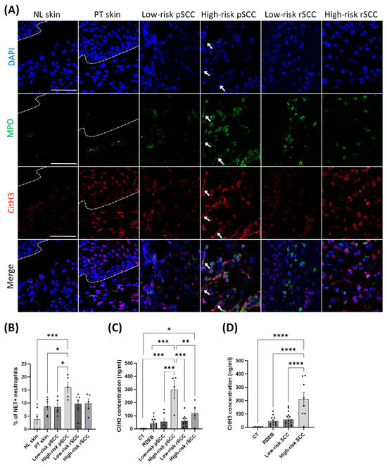 Neutrophils have been shown to promote cancer dissemination through the formation of NETs in the TME [39]. To assess whether neutrophil infiltration in the TME of RDEB-SCCs was associated with NET formation, we performed immunostaining for MPO and citrullinated histone H3 (citH3), which are specific markers for neutrophils and NETosis [40], respectively, and with DAPI for DNA (Figure 4A). We found increased NET formation in high-risk pSCCs compared with low-risk pSCCs, peri-tumoral skin, and non-lesional skin, as measured by co-staining for MPO, citH3, and DAPI (Figure 4B).