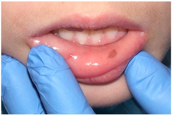 Oral melanotic macula on the lower labial vestibular mucosa on a 7-year-old patient. Parents referred these lesions as being present for over 6 months. (archive S.A., patient signed the consent for clinical pictures).