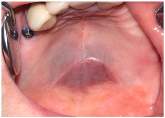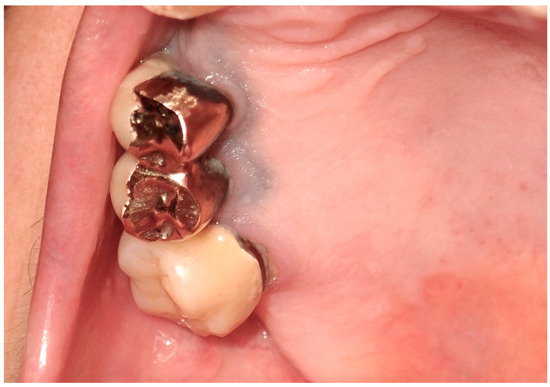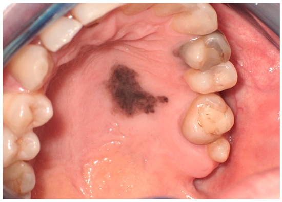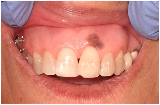 Exogenous oral pigmentation is a noteworthy subject due to its frequent occurrence and the diverse sources from which it arises. Typically benign, this pigmentation results from foreign substances introduced into the oral mucosa [69]. A common example is the amalgam tattoo, which occurs when small particles from dental amalgam fillings become accidentally embedded in the soft tissues of the mouth during dental procedures (Figure 8). These tattoos appear as gray, blue, or black spots, usually near the site of dental work [70]. Amalgam tattoos are a prevalent form of exogenous pigmentation, arising typically from dental procedures where amalgam material is inadvertently embedded in the soft tissues. They are characterized by their distinctive blue or black coloration and are identified near areas of dental restorations [71]. Exogenous pigmentations can also occur from old materials used in endodontic fillings, which can traverse the bone and tissues, causing pigmentation of the mucosa at the level of the involved tooth apex. Diagnosis primarily relies on clinical examination, but radiographs or biopsy should be employed when the origin of the pigmentation is unclear, to distinguish them from more serious conditions. Radiographic examination is preferred for the differential diagnosis of amalgam/metal tattoos when suspected. A biopsy is recommended when radiographic examination does not reveal the presence of metal particles, even if clinical suspicion leans towards an amalgam tattoo, particularly in solitary cases, since these lesions enter into differential diagnosis with nevi and melanoma [72]. Management of these pigmented lesions generally does not require intervention unless there is an aesthetic concern or a need to confirm the benign nature of the pigmentation. The prognosis for patients with amalgam tattoos and similar forms of exogenous pigmentation is generally good, underscoring the importance of awareness and understanding of these conditions among dental professionals [73].