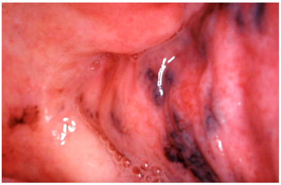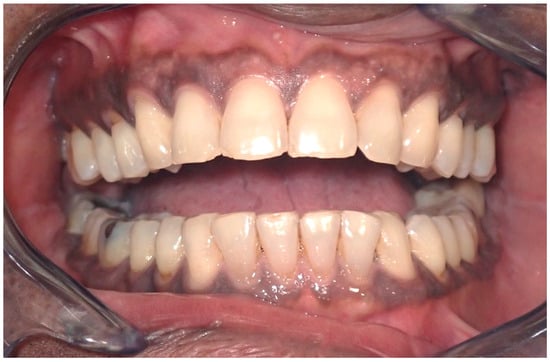 Tobacco-associated oral melanosis is characterized by diffuse, brown to brown-black hyperpigmentation of the oral mucosa, observed in approximately 20–30% of chronic tobacco users (Figure 6). This condition predominantly affects the gingiva, hard palate, and buccal mucosa, with the severity of pigmentation directly proportional to the cumulative exposure to tobacco. It is hypothesized that melanogenesis induced by tobacco consumption acts as a defensive mechanism against the cytotoxic components of tobacco smoke, including polyaromatic hydrocarbons, nicotine, and benzopyrene [53,54]. An investigative study on the Indian population described the prevalence of oral melanin pigmentation among both smoke and smokeless tobacco users, thereby broadening the understanding of tobacco’s impact on oral health beyond conventional smoking practices [55]. Notably, cessation of tobacco use is associated with a gradual reduction in melanotic manifestations, highlighting the reversible nature of smoker’s melanosis upon withdrawal [56].