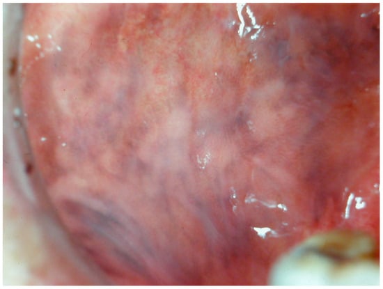 - Kartland Vieira, D.L.P.; De Lima, M.H.A.; De Oliveira Lima, A.L.; Peixoto, F.B.; Beder Ribeiro, C.M.; De Melo Franco, A.V.; Ferreira Soares, S.M. Pigmented Oral Lichen Planus: Report of Three Cases. Oral Surg. Oral Med. Oral Pathol. Oral Radiol. 2014, 117, e185. [Google Scholar] [CrossRef]