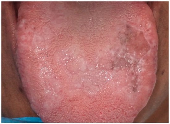 Drug-induced oral melanosis results from the chromatic alteration of the oral mucosa, with an estimated 10–20% of acquired oral pigmentations induced by certain medications. Antimalarials such as chloroquine, hydroxychloroquine, and quinacrine are prominently implicated in the development of drug-induced oral pigmentations [74]. Additional medications involved include antipsychotics such as chlorpromazine; chemotherapeutics like bleomycin, imatinib, busulfan, fluorouracil; antifungal drugs including ketoconazole; antimicrobial drugs such as tetracycline and minocycline; and antiretroviral drugs such as zidovudine [7,75,76]. Pigmentation may affect all oral surfaces, be localized to a single site, or spread to multiple sites, with the hard palate, gingiva, and tongue being the most affected (Figure 9).