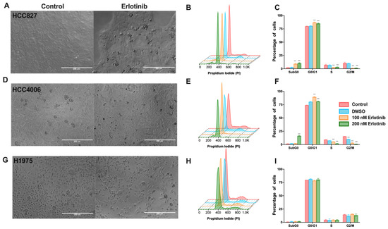 Microscopic observation of the cultures of HCC827 and HCC4006 cell lines revealed that the tested concentrations of erlotinib caused mainly a cytostatic effect (Figure 1A,D), observed as a gradual reduction in cell density after 48 h. Dose–response curves are shown in Figure S1. The highest concentration reduced cell density by approximately 50% compared to that of the control culture. A total of 100 nM (low) and 200 nM (high) concentrations of erlotinib were selected for further analysis since we observed cell-cycle arrest and increased proportion of cells in the G0/G1 phase, with a concomitant reduction in the S and G2 phases. In addition, the highest concentration of erlotinib induced a minimal proportion (10–20%) of apoptotic and necrotic cells (Figure S1B,C), detected as a sub-G0 peak (Figure 1B–F). Our results suggest that S-phase and G2 cells are more susceptible to TKI-induced cell death (Figure 1C,F). Several reports have indicated that the H1975 cell line, which harbors the T750M mutation, is not affected by erlotinib. We exposed this cell line to erlotinib as a control of resistance. We confirmed that, under our experimental conditions, these cells were not susceptible to this drug, as the wide range of concentrations tested did not affect cell viability nor the proportion of cells in different phases of the cell cycle (Figure 1G–I). Therefore, erlotinib in the HCC827 and HCC4006 cell lines mainly caused a cytostatic effect (Supplementary Figure S1).