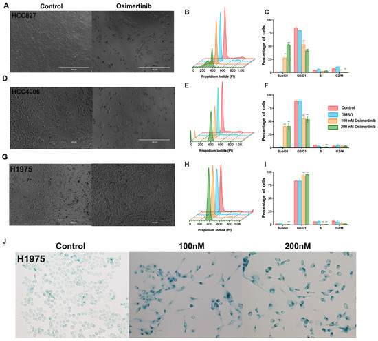 Effect of osimertinib exposure on EGFR-mutated lung adenocarcinoma cell lines. Morphological changes induced by single 200 nM osimertinib exposure (A,D,G). Magnification 20×. Histograms show the profile of cell distribution and graphs of the percentage of cells in the cell-cycle phases and the sub-G0 peak induced by osimertinib in the HCC827 (B,C), HCC4006 (E,F), and H1975 (H,I) cell lines. Data are shown as mean ± SD. **** p < 0.0001. (J). After a single 48 h exposure to osimertinib, residual cells from the H1975 cell line were cultured in fresh complete media for five days, and the expression of beta-galactosidase was detected. Micrographs show β-gal-positive cells. Magnification 40×.