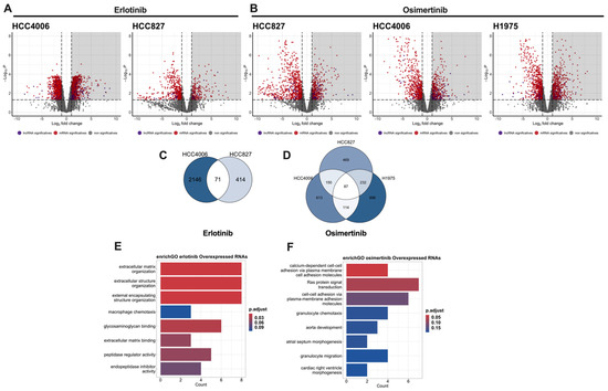Differentially expressed genes (DEGs) in DTP cells. Volcano plots showing DEGs in DTPs relative to untreated cells. Gray shading indicates overexpressed transcripts (A,B). Venn diagrams of the overexpressed genes shared among DTP cells (C,D). Functional annotation of the overexpressed lncRNAs was performed using the Gene Ontology (GO) biological process database (E,F).