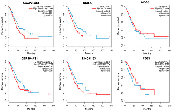 To explore the clinical relevance of the overexpressed lncRNAs, Kaplan–Meier (K–M) curves were generated from the LUAD project of TCGA. High expression of the erlotinib-DTP-associated lncRNAs AGAP2-AS1 and NKILA was associated with poor OS. Similarly, high expression of the osimertinib-DTP-associated lncRNAs CERS6-AS1, LINCO1133, and the protein-coding gene CD74 correlated with poor OS (Figure 4). The overexpression of these clinically relevant lncRNA and CD74 was further validated in the DTP cells.