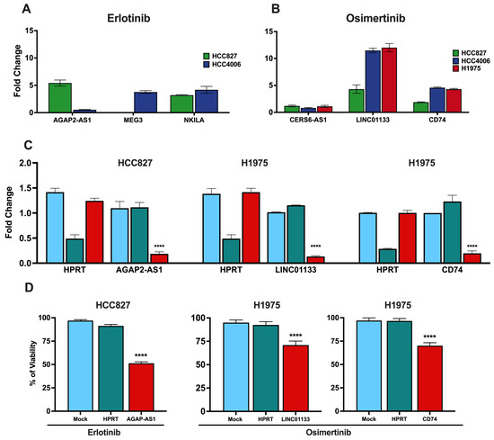 Gene expression of clinically relevant lncRNAs detected in DTP cells. Expression of the lncRNAs detected in the erlotinib- and osimertinib-induced DTP cells. Fold changes relative to the control are shown (A,B). DsiRNA-mediated knockdown reduced the expression of lncRNAs AGAP2-AS1 in the HCC827 cell line and LINC01133 and CD74 in the H1975 cell line (red). Mock (light blue) and DsiRNA against HPRT (green) were used as controls (C). Knockdown of the DTP-associated lncRNAs reduced cell viability after a single exposure to TKIs (D). Data are shown as mean ± SD of three independent experiments. **** p-value < 0.05.