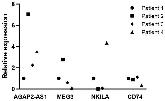 Expression of clinically relevant lncRNAs and CD74 in tumor biopsies. Expression of DTP-associated genes in four FFPE lung adenocarcinoma biopsies detected using RT–qPCR. Gene expression was normalized to GAPDH and compared to that of Patient 1.