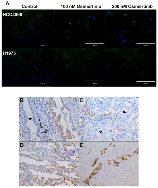 CD74 expression in lung adenocarcinoma. Immunofluorescence analysis of CD74 in osimertinib-induced DTP cells. CD74 mainly showed cytoplasmic staining, which increased in osimertinib-induced DTP cells. CD74 (green) and nuclear staining (blue). Magnification 20× (A). Lung adenocarcinoma biopsies. Comparison of CD74 staining between normal ciliated epithelial cells (star) and malignant cells (B). CD74-negative (arrow) and CD74-positive tumor cells within the same niche (C). Tumor cells expressing varying levels of CD74 (D). High CD74 staining was observed in tumor cells with invasive morphology (E). Magnification 20×.
