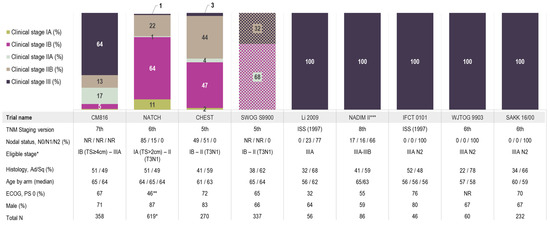 Stage distribution and key patient characteristics across the base case studies. * One patient was included in NATCH despite having stage IV disease (T4N0); ** 1% in NATCH had ECOG Performance status of 2; *** NADIM II included stage IIIA to IIIB patients based on the 8th edition for TNM staging which aligns with stage IIIA of the 7th edition as they did not include T4N2 or anyone with N3 disease. Abbreviations: PS, performance status; TS, tumour size. Note: SWOG S9900 was the only study that reported staging in two distinct groups (IB/IIA and IIB/IIIA) and as such, is visualized distinctly from the rest of the studies; 68% of patients had stage IB/IIA disease (presented in a purple and light sage cross-hatch pattern) and 32% of patients had stage IIB/III disease (presented in a light brown and dark navy cross-hatch pattern).