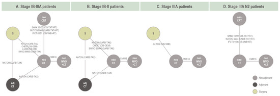 The eight RCTs included in the analysis of EFS formed a connected network of evidence in the stage IB-IIIA target population (Figure 2A), including data from 1978 patients and 18 trial arms (17 effective arms due to the pooling of two neoCRT arms in IFCT 0101). All networks of evidence were primarily star-shaped, with one closed loop formed by one three-arm trial (NATCH) in the stage IB-IIIA and stage IB-II networks (Figure 2A,B). This network geometry precluded inconsistency assessment. Data inputs and endpoint definitions informing the EFS NMA are provided in Table S10.