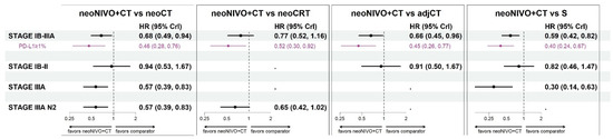 Event-free survival hazard ratio estimates for neoNIVO + CT vs. all relevant comparators across base case and the PD-L1 specific models (fixed-effect model estimates). Note: the results associated with PD-L1 ≥ 1% specific target population conducted within the stage IB-IIIA network are illustrated in purple. Sensitivity results are available in Figure S4; the EMA-target results are available in Tables S16–S18; Figures S8–S10. Abbreviations: adj, adjuvant; CrI, credible interval, CT, chemotherapy; CRT, chemoradiotherapy; HR, hazard ratio; neo, neoadjuvant; NIVO, nivolumab; S, surgery.