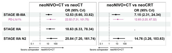 Pathological complete response odds ratio estimates for neoNIVO + CT vs. all relevant comparators across base case and the PD-L1 specific models (fixed-effect model estimates). Note: The stage IB-II cases are not represented in the figure as they were only informed by CheckMate 816 (odds ratio: 6.85; 95% confidence interval: 1.89, 24.76) and as such, no NMA was conducted for this stage. Abbreviations: CrI, credible interval; CT, chemotherapy; CRT, chemoradiotherapy; neo, neoadjuvant; NIVO, nivolumab; OR, odds ratio.