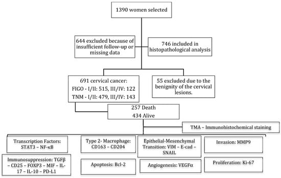Flowchart of the women included in the study (2003–2017). FIGO/TNM predicts the outcome and determines the type of treatment that will be given. FIGO/TNM: stage I—confined to the organ of origin; stage II—invasion of surrounding organs or tissue; stage III—spread to distant lymph nodes or tissue within the pelvis; stage IV—distant metastasis. Tissue microarray (TMA) immunohistochemistry staining was evaluated for transcription factors (STAT3 and NF-κB), Type 2 Macrophage (CD163-CD204), Epithelial–Mesenchymal Transition (VIM, E-cad and SNAIL), Invasion (MMP9), Immunosuppression (TGFβ, CD25, FOXP3, MIF, IL-17, IL-10, and PD-L1), Apoptosis (Bcl-2), Angiogenesis (VEGFα), and Proliferation (Ki-67).