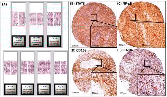Intracellular signaling modulation in TME by STAT3 and NF-κB pathways via CD163/CD204 M2-TAM. Modulation of intracellular signaling in the TME through the STAT3 and NF-κB pathways and immunostaining of M2-TAM through the biomarkers CD163 and CD204. (A) Tissue Microarray (TMA) slides in hematoxylin and eosin (H&E) with duplicates of the 746 patients performed in 2021, (B) brownish-brown diffuse staining with strong positive cytoplasmic/nuclear staining for anti-STAT3 (red arrow), (C) specific brownish-brown staining with strong positive cytoplasmic staining for anti-NF-κB (red arrow), (D) specific moderately diffuse brownish-brown staining with strong positive cytoplasmic staining for anti-CD163 (red arrow), and (E) moderately diffuse brownish-brown staining with strong positive cytoplasmic/nuclear staining for anti-CD204 (red arrow) in primary cervical cancer. The immunohistological profile presents images at 200× magnification; 400× magnification is shown in the lower right corner of each image. Arrow: the tumor cell with intracellular staining (cytoplasmic and/or nuclear) depending on each immunohistochemical marker.