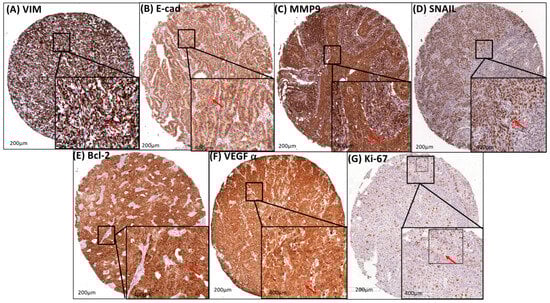 Protein expression profiles of cervical tumors to evaluate EMT, Invasion, Apoptosis, Angiogenesis, and Cell Proliferation. (A) diffuse brownish-brown coloration with strong cytoplasmic/membrane staining for anti-VIM (red narrow), (B) diffuse brownish-brown coloration with strong cytoplasmic/membrane for anti-E-cad (red narrow), (C) diffuse brownish-brown coloration with strong cytoplasmic staining/nuclear staining for anti-MMP9 (red narrow), (D) diffusely brownish-brown staining with strong nuclear staining for anti-SNAIL (red narrow), (E) diffusely brownish-brown staining with strong cytoplasmic/nuclear staining for anti-Bcl-2 (red narrow), (F) diffusely brownish-brown staining with strong cytoplasmic staining for anti-VEGFα (red narrow), and (G) restricted brownish-brown staining with some strong nuclear staining for anti-Ki-67 (red narrow) on Tissue Microarray (TMA) with primary cervical cancer. The immunohistological profile presents images at 200× magnification; 400× magnification is shown in the lower right corner of each image.