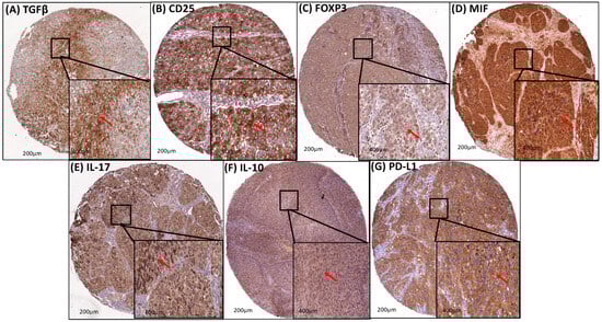 Protein expression profiles of cervical tumors to assess immunosuppression. Strong diffuse brownish-brown cytoplasmic staining for anti-TGFβ (A), anti-CD25 (B), anti-FOXP3 (C), anti-MIF (D), anti-IL-17 (E), anti-IL-10 (F), and anti-PD-L1 (G) in TMA with primary cervical cancer. Red arrow: brownish-brown cytoplasmic staining.