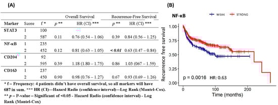 Based on Kaplan–Meier analysis, the STAT3, CD163, and CD204 expression had no significant correlation with the overall survival rate and recurrence-free rate, except the NF-κB expression (p < 0.01) that had a significant correlation with a recurrence-free survival rate. The patients who showed a higher NF-κB expression had a significantly more favorable outcome in recurrence-free survival than those with a lower expression (Figure 5).