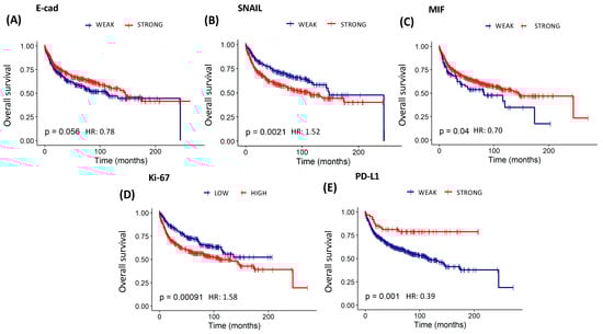 The study found statistically significant overall survival curves for E-cad (p < 0.05), SNAIL (p < 0.01), PD-L1 (p < 0.01), MIF (p < 0.05), and Ki-67 (p < 0.001) (Table 10 and Figure 6). Patients with a higher expression of E-cad (HR: 0.78) and MIF (HR: 0.70), as well as a lower expression of PD-L1 (HR: 0.39), had a significantly more favorable outcome when overall survival was analyzed. On the other hand, patients who showed a higher expression of SNAIL (HR: 1.52) and Ki-67 (HR: 1.58) had a significantly less favorable outcome in overall survival. Likewise, statistically significant recurrence-free survival curves to PD-L1 and Ki-67 (both p < 0.05) were found, pointing out that patients with a lower expression of PD-L1 (HR: 0.53) had a higher disease-free chance. On the other hand, those who had a higher expression of Ki-67 (HR: 1.44) showed a higher recurrence risk (Table 10 and Figure 7).
