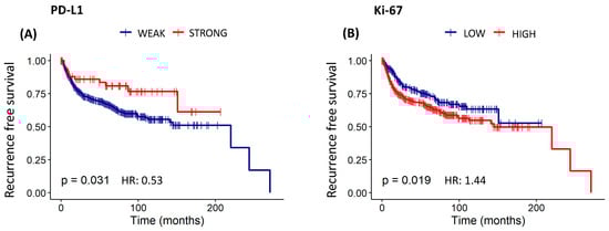 Survival analysis of the risk model by PD-L1 and Ki-67 protein expression in 691 patients with cervical cancer. Kaplan–Meier Recurrence-Free Survival Curve estimated by staining of (A) PD-L1 (log-rank χ2 = 0.53; p = 0.031), and (B) Ki-67 (log-rank χ2 = 1.44; p = 0.019).
