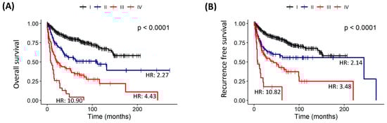 In this study, the relationship between the TNM staging and death had a statistically significant correlation when overall survival and recurrence-free survival curves were studied using the Kaplan–Meier analysis (all p < 0.0001). In this context, patients with a higher stage (III and IV) had a significantly less favorable outcome in overall survival (III-HR: 4.43; IV-HR: 10.90) and recurrence-free survival (III-HR: 3.48; IV-HR: 10.82) (Table 12, and Figure 8).