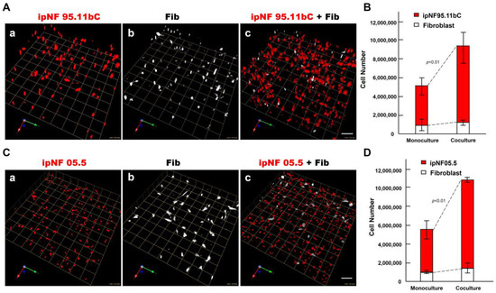An increase in the growth of pNF1 spheroids formed by pNF1 cells was observed in the presence of fibroblasts in 6-day 3D cultures. (A) Representative images of 3D reconstructions of monocultures of pNF1 cells [ipNF95.11b C (A(a)), ipNF05.5 (C(a)); red] or fibroblasts (primary fibroblasts 05.2; (A(b),C(b)); pseudo-white) and pNF1 cell:fibroblast cocultures (A(c),C(c)). Images are tiled from 16 ((A); a grid and a scale bar, 170 μm) or 9 ((C); a grid and a scale bar, 128 μm) contiguous fields. (B,D) Total number of nuclei of pNF1 spheroids [ipNF95.11b C (B) and ipNF05.5 (D); red bars] and fibroblasts (white bars) when grown alone (monoculture) or in coculture were quantified in 3D with Volocity. Data are expressed as mean ± standard deviation.