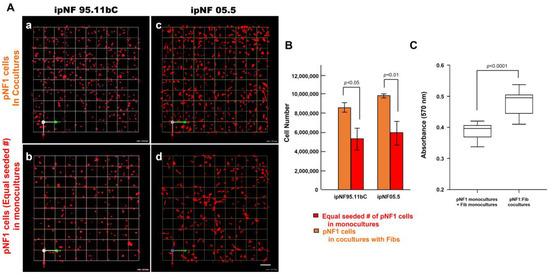 An increased growth of pNF1 spheroids resulted from coculturing them with fibroblasts over a 6-day culture period. (A) En face views of 3D reconstructions of pNF1 cell [ipNF95.11b C (a,b) and ipNF05.5 (c,d); red]: fibroblast cocultures (a,c) and pNF1 monocultures (b,d) at day 6. Only pNF1 spheroids are visualized in a and b. The initial cell seeding number of pNF1 cells in monocultures in b and d is the same as total number of cocultures. Images are tiled from 9 contiguous fields; each grid and a scale bar represent 128 μm. (B) The number of nuclei of only pNF1 spheroids was quantified in 3D with Volocity. Data are expressed as mean ± standard deviation. (C) Monocultures of pNF1 cells (ipNF95.11b C) or fibroblasts and cocultures of pNF1 cells and fibroblasts were incubated for 6 days. Cell growth/viability was measured using a 3D MTT assay. The OD values of cocultures were compared with ones of two monocultures, i.e., pNF1 cells alone and fibroblasts alone.