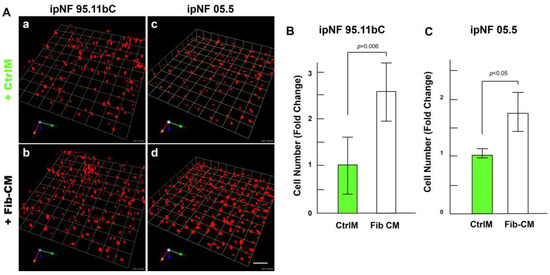 The observed increase in the growth of pNF1 spheroids in 3D cocultures with fibroblasts suggests that paracrine factors secreted from fibroblasts mediate tumor growth in pNF1 progression. Therefore, we investigated whether the observed increase in the growth of pNF1 spheroids with fibroblasts could be caused by paracrine secretory factors from fibroblasts. The effects of Fib-CM or control media (CtrlM) were compared in pNF1 monocultures over a 6-day culture period. The growth of pNF1 spheroids formed by ipNF95.11b C cells increased by about 2.5-fold in Fib-CM compared to those in control media (Figure 4A(a,b),B. An increase in pNF1 spheroid growth in the absence of direct contact with fibroblasts indicates that the fibroblast-derived secretome induces pNF1 cell growth via paracrine interaction. These results were consistent with ipNF05.5 cells under the same conditions. We observed about a 2-fold increase in cells in Fib-CM compared to those in control media (Figure 4A (c,d),C).