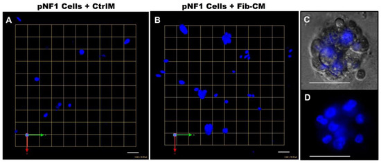 Fibroblast-derived CM increases the spheroid formation of pNF1 cells. (A,B) En face views of 3D reconstructions of Hoechst33342-stained pNF1 spheroids (blue) formed by ipNF95.11b C in CtrlM (A) or Fib-CM (B). Images are from a single field; each grid and scale bars represent 43 μm. (C,D) Enlarged DIC (C) and Hoechst-stained 3D images (D) illustrate a pNF1 spheroid in greater detail; scale bars, 43 μm.
