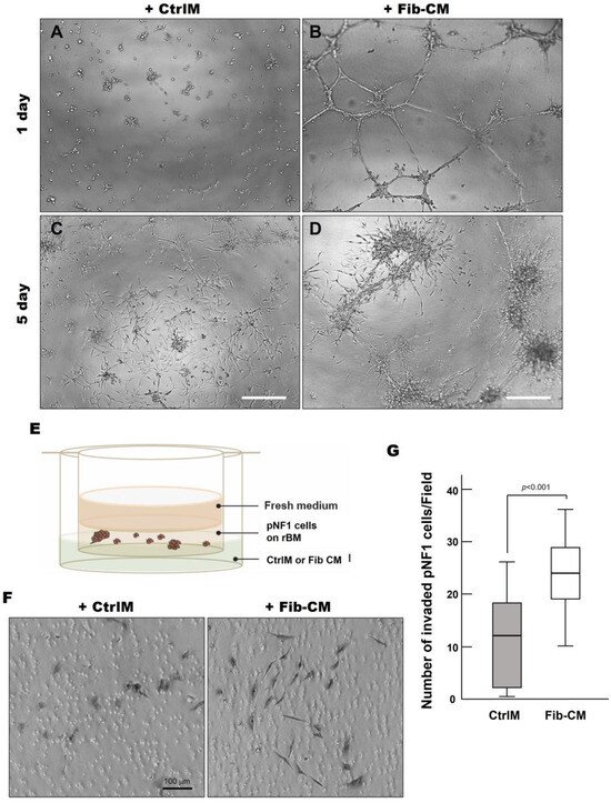 Fibroblast-derived secretome increases the invasive outgrowth and local invasion of pNF1 spheroids. (A–D) DIC images of pNF1 spheroids in CtrlM (A,C) or Fib-CM (B,D) at 1 and 5 days. mScale bars, 500 µm. (E) Schematic of in vitro 3D invasion assay: pNF1 spheroids were cultured in the presence of control media (CtrlM) or fibroblast-conditioned media (Fib-CM). (F) DIC images of invaded cells attached to the underside of the insert. Scale bar, 100 µm. (G) Invaded pNF1 spheroids incubated in the presence of CtrlM (gray bar) or Fib-CM (white bar) for 2 days were quantified with ImageJ.