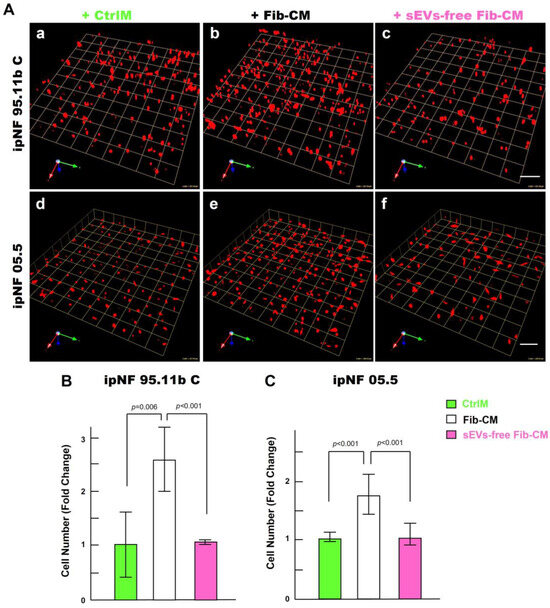 Effects of the fibroblast-derived secretome on the increase in the growth of pNF1 spheroids are abolished by sEVs depletion. (A) Angled views of representative 3D reconstructions of pNF1 spheroids (red) formed by ipNF95.11b C (a–c) or ipNF05.5 (d–f) in CtrlM (a,d), Fib-CM (b,e), or sEV-deprived Fib-CM (c,f) at 6 days. Images are tiled from 9 contiguous fields; each grid and scale bars represent 128 µm. (B,C) Total number of nuclei of ipNF95.11b C (B) or ipNF05.5 (C) incubated with CtrlM (green bars), Fib-CM (white), or sEVs-free Fib-CM (pink), as quantified with Volocity.
