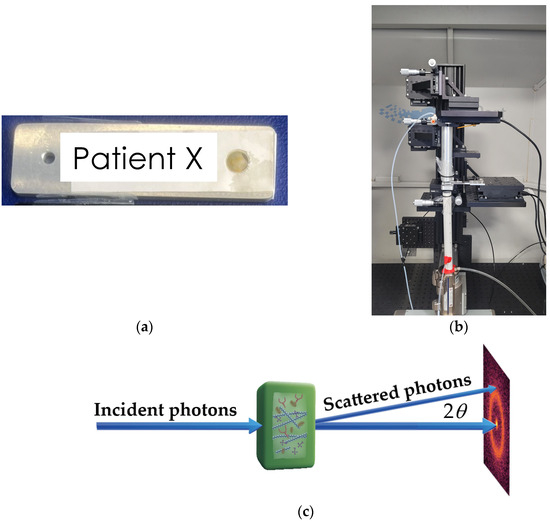 (a) Human breast tissue sealed within a 5 mm aperture bespoke sample holder; (b) EosDx X-ray diffractometer; (c) schematics of the experiment.