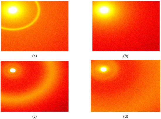 Typical X-ray scattering patterns obtained for (a) non-cancer samples measured at the sample-to-detector distance of 16 cm, (b) cancer samples measured at 16 cm, (c) non-cancer samples measured at 2 cm, and (d) cancer samples measured at 2 cm.