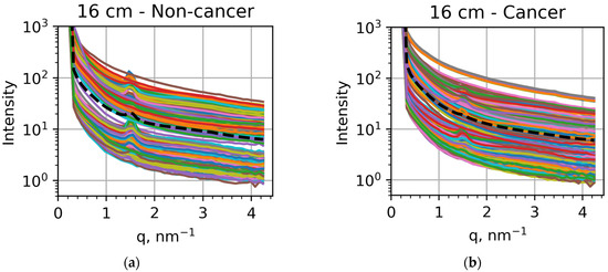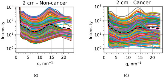 If we compare the averaged intensities, shown as black dashed curves, we can confirm the results of previous studies [37,38,39,40,41,42] related to lipid metabolism. For the 16 cm measurements, the peak at q = 1.5 nm−1 is very pronounced in non-cancer samples (Figure 3a) but much less visible in cancer samples (Figure 3b). For the 2 cm measurements, the peak at q = 14 nm−1 is clearly seen in non-cancer samples (Figure 3c) but less pronounced than the peak at q = 20 nm−1 in cancer samples (Figure 3d). These findings confirm previously obtained results relating these peak modifications to lipid metabolism [30,31,32,34,35]. However, the individual measurements can be significantly different from these general trends, as seen in all the panels of Figure 3. In particular, the 1.5 nm−1 peak appears in many cancer samples (Figure 3b). In contrast, the 20 nm−1 peak dominates the one at 14 nm−1 for many non-cancer samples (Figure 3c). Correspondingly, to reveal all the tendencies and facilitate the applications of this approach to actual diagnostics, we applied machine learning techniques.