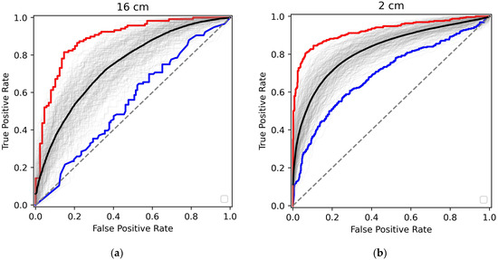 We trained the Random Forest Classifier procedure on 60% of measurements, using the remaining 40% for the test to determine the outcome metrics, with the same percentage of cancer patients in both clusters as in the total dataset. Several measurements of a single patient were kept in the same training or test clusters. Such training/test sequences were performed 200 times. The ROC curves for the test sets are shown in Figure 4 for both 16 cm and 2 cm measurements.