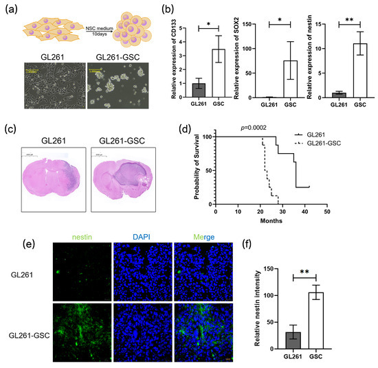 GL261 cells were induced into GL261 stem cells after being cultured in an NSC medium for 10 days (referred to as GL261-GSC). The stemness properties of GL261-GSCs were evaluated according to their capability to form neurospheres (Figure 1a) and the expression of stem cell markers, CD133, SOX2, and nestin (Figure 1b). C57BL/6 mice were orthotopically administered by GL261 or GL261-GSCs, named GL261 mice or GSCs mice. After 21 days of cell inoculation, the mice’s brains were removed and sectioned at the insertion site to show the HE-dyed pictures. The tumors of the GSC group mice exhibited enlarged volumes (Figure 1c) and a significantly reduced life span (Figure 1d). The immunofluorescence assay indicated more aggregated nestin in the GSCs tumor nests (Figure 1e,f), which illustrated the maintained stemness of GL261-GSCs in vivo.