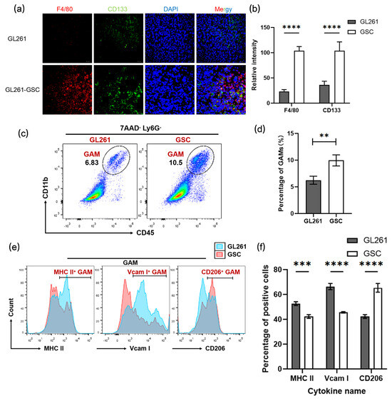 The macrophage marker F4/80 and the stem cell marker CD133 were employed to identify the macrophage composition of tumors. The increased F4/80+ macrophage infiltration found in GSC mice tumor tissue was almost surrounded by CD133+ cells (Figure 2a,b). Tumor tissues isolated from GL261/GL261-GSCs mice were digested into a single-cell suspension and subjected to FACs, which revealed the significantly higher percentage of GAMs (CD11b+ CD45+ 7AAD− Ly6G−) cells in GSC tumor tissues (Figure 2c,d and Figure S1). In addition, it was the population of M2-type macrophages (CD206+), not M1-type macrophages (MHC II+, Vcam I+), that occupied most of the GAMs (Figure 2e).
