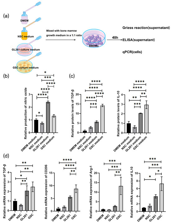 GL261-GSCs induce macrophage M2 polarization: (a) BMDMs were cocultured with blank DMEM medium, blank NSC medium, culture medium of GL261 cells, and culture medium of GL261-GSCs; (b) relative quantitative results of the Griess experiment in the culture medium of four groups of BMDMs (BMDMs cultured with blank DMEM medium, blank NSC medium, culture medium of GL261 cells, and culture medium of GL261-GSC cells) (n = 3); (c) relative quantitative results of ELISA experiment of TGF-β and IL10 protein levels in the culture medium of four groups of BMDMs (BMDMs cultured with blank DMEM medium, blank NSC medium, culture medium of GL261 cells, and culture medium of GL261-GSC cells) (n = 3); (d) relative quantitative results of qRT-PCR analysis of the expression TGF-β, CD206, Arg-1, and IL-10 in four groups of BMDMs (BMDMs cultured with blank DMEM medium, blank NSC medium, the culture medium of GL261 cells, and the medium of GL261-GSC cells) (n = 3). Data are presented as mean ± S.D. p-value is determined by ordinary one-way ANOVA (* p < 0.05, ** p < 0.01, *** p < 0.001, **** p < 0.0001).